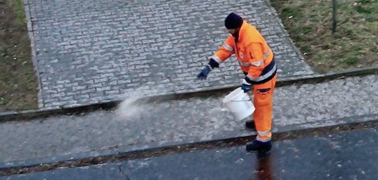 Zunächst wurden die Hauptverkehrsstraßen gestreut, bevor ab 10 Uhr dann auch die Nebenstraßen an der Reihe waren. Dabei hielt sich der Bauhof an die Straßenreinigungssatzung der Stadt, worin die Straßen und deren Rangfolge im Streudienst festgelegt sind. „Besonders tückisch sind nicht nur Straßen mit großem Gefälle, sondern auch gepflasterte Straßen, wo die Kälte aus dem Boden immer wieder durch die Fugen kommt“, so Kaluza. So war der Streudienst im Ledderhoser Weg dreimal in kürzester Zeit im Einsatz.