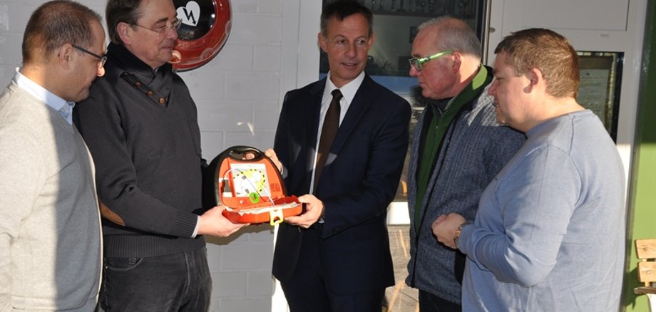 Foto: Eine Einweisung in die Handhabung des Defibrillators gab Philipp Köhler (rechts). Udo Bausch (3.v.r) bedankte sich für die Spende bei Stefan Tullius (2.v.l.) und Christoph Dietrich (links). Zweiter von rechts ist Stadionmeister Wolfgang Mohns.