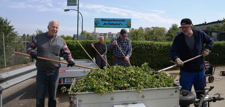 Foto oben: Gemeinschaftssinn gehört zum Gärtnern im Verein dazu, nicht nur zum Saisonstart: Hier bringen Pächter der Kleingartenanlage „Städterpfad“ mit Heckenschere und Schaufel ihre Anlage in Form.