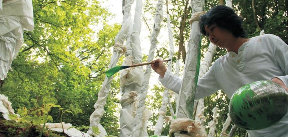 Das Papier wird in den nächsten Wochen zu einer Einheit mit der Rinde des Baumes, mit dem Moos auf dem Stamm, die raue Rinde durchdringt das Papier, das Papier haftet an der Rinde. Die Natur wird zu Malgehilfin des Künstlers Kenbo/Liang Guojian, Wind und Wetter werden über Wochen Farbe und Papier verändern.