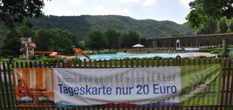 Foto: Auf Bannern wirbt das Bäderhaus für seinen Sommerpreisaktion.