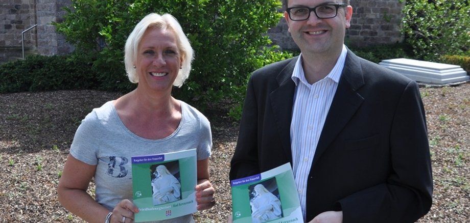 Foto: Friedhofsverwalter Carsten Störk und Stellvertreterin Christine Senft-Witt mit dem neuen Friedhofswegweiser.
