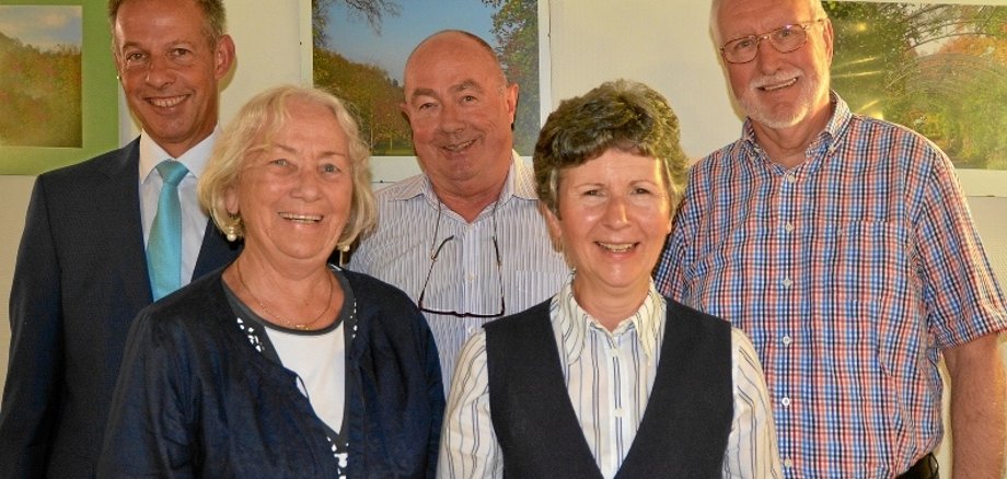 Foto: Vorsitzender Udo Bausch mit den neuen Vorstandsmitgliedern Ingrid Merk, Rolf Bühring, Suzanne Kompalla und Friedhelm Harrendorf (von links).