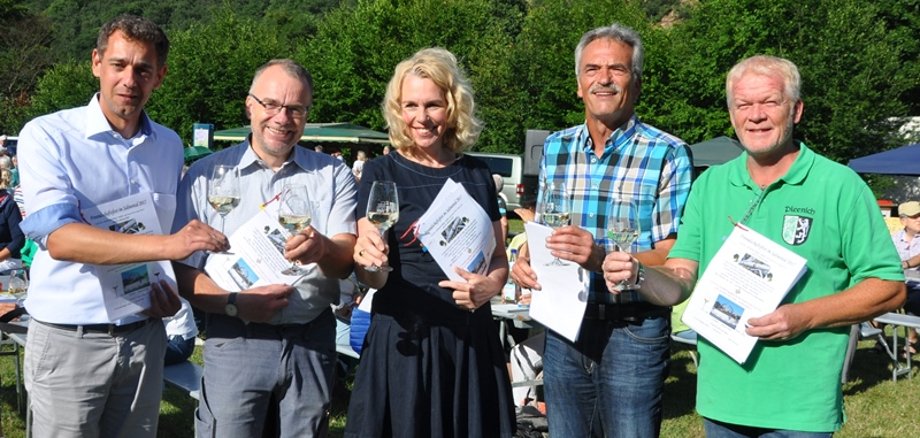 Foto oben: Sie eröffneten gemeinsam das Freundschaftsfest: Mirko Helmut Kohl (Ortsvorsteher Winzenheim), Dr. Volker Hertel (Bosenheim), OB Dr. Heike Kaster-Meurer, Norbert Welschbach (stellv. Ortsvorsteher BME) und Dirk Gaul-Roßkopf (Planig)