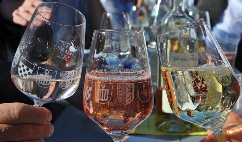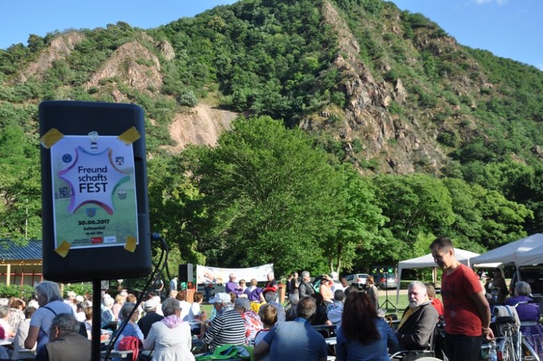Mit der Oberbürgermeisterin scherzten die Ortsvorsteher, wer denn nun das schöne Wetter ins Salinental mitgebracht hatte. Kurz vor der Eröffnung um 18 Uhr zogen bedrohliche Wolken am Himmel auf und es tröpfelte. Doch rechtzeitig kehrte die Sonne zurück und tauchte diesen Teil des wunderschönen Naturcanyons mit seinem saftigen Grün in ein romantisches Abendlicht. Zunächst waren es rund 150 Besucherinnen und Besucher, eine Zahl die sich nach 19 Uhr fast verdoppelte, vermutlich, weil diese Gäste dann dem guten Wetter trauten. Die entspannte Atmosphäre zeigte sich auch beim geduldigen Schlange stehen an den Versorgungsständen, dem Gemeinschaftsstand der Winzer Weingut Rotenfels, Zehmer, Espenschied, Mühlenhof, Anheuser und Butzbach, bei der Dorfjugend Ippesheim (Bratwurst, Pommes und Waffeln) sowie Mühle Kügler (Flammkuchen).