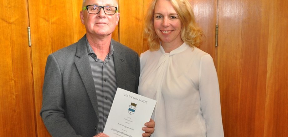In den 80er Jahren hat er die Bad Kreuznacher Sportszene mit Tennisschlägern und Skibindungen versorgt, erzählte er in einer Feierstunde zu seinem Arbeitsjubiläum von seinen Stationen als Verkäufer in Sportartikelabteilungen bzw. Geschäften. Oberbürgermeisterin Dr. Heike Kaster-Meurer bedankte sich bei Wolfgang Mohns mit einer Urkunde und einem Weinpräsent.