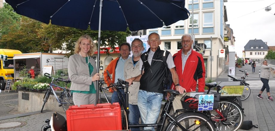 Foto: Oberbürgermeisterin Dr. Heike Kaster-Meurer unterstützt „KLARA“ bei ihrer Werbung um weitere Fahrer(innen). Auf dem Foto: Reiner Schmitt (zag-büro), Initiator Pitt Elben, Fahrer Hans-Peter Klein und Thomas Fischer (Stadtverwaltung)