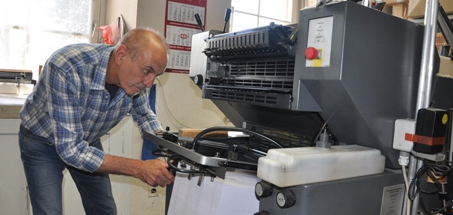Im Erdgeschoss des Stadthauses sind drei Räume, die von den Besuchern weitgehend unbeachtet liegen, aber in denen rege Betriebsamkeit herrscht und aus denen das monotone Rattern der Maschinen klingt. Manchmal geht es in der Hausdruckerei der Stadtverwaltung zu wie in einem Taubenschlag. Abgeholt werden Eintrittskarten der Museen, Tickets für die Naheweinprobe auf dem Riesenrad, Veranstaltungsflyer wie beispielsweise für das städtische Freundschaftsfest oder die Interkulturellen Wochen, Plakate für VHS-Veranstaltungen, das Neustadt-Blatt, das „Daumenkino“ mit einer Fotoserie zur einstigen Großbaustelle für das Brückenfest, Schülerzeitung und Lernfibeln für Deutsch in den Kitas und in der Grundschule, Visitenkarten für die Verwaltung, Stimmzettel für Wahlen und vieles mehr. Seit mehr als 20 Jahren arbeitet Fritz Schuster in der Hausdruckerei der Stadtverwaltung und geht Anfang nächsten Jahres in Rente. Der „Druckformenhersteller“ verfeinerte sein Handwerk in verschiedenen Betrieben, dazu zählten die Druckereien Ferdinand Harrach, in der einst der Oeffentliche Anzeiger hergestellt wurde, und Förner GmbH, zu dessen Kunden Shell Holland und der Kölner Verlag M. DuMont Schauberg (heute Dumont Mediengruppe) gehörten.