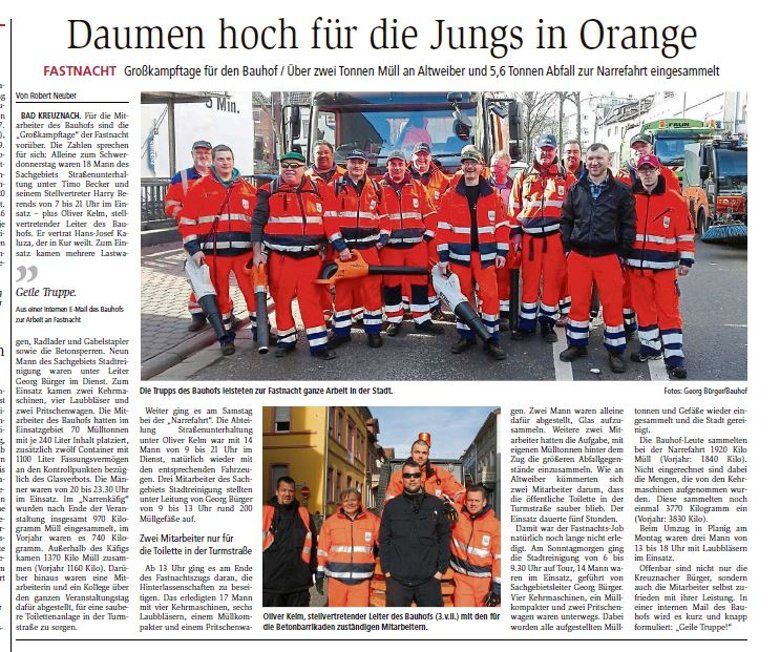 "Daumen hoch für die Jungs in Orange", lautet die Schlagzeile über dem Bericht in der Allgemeinen Zeitung Bad Kreuznach vom 1. März über die "Großkampftage" des Bauhofes während und nach der Straßenfastnacht. Für die flotte und gründliche Mülbeseitigung in der närrischen Zeit gibt es viel Lob aus der Bevölkerung. Der Chef der städtischen Müllabfuhr und Straßenreinigung, Georg Bürger, ist daher sehr stolz auf seine "fleißige Truppe".