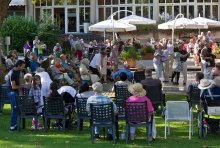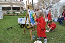 Kinder nagelten, von ihren Betreuern unterstützt, die Umrandung des Hotels zusammen.