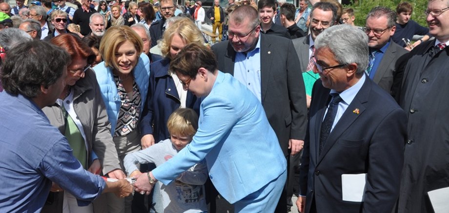 Foto oben: Monika Schneider und die kleine Käthe Kappaun beim Durchschneiden des Bandes.