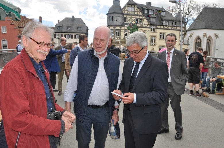 Oberbürgermeisterin Dr. Heike Kaster-Meurer ließ ein bewegtes Kapitel Brückengeschichte Revue passieren. Vor zehn Jahren waren bei einer Routine-Untersuchung Schäden an der Alten Nahebrücke entdeckt worden. Erst Sanierung, dann Neubau und letztlich doch Sanierung beschrieb sie das Auf und Ab der Planungs- und Entscheidungsphase. Das Urteil des Leiters des LBM, Norbert Olk, der eine Sanierung für rund fünf Millionen Euro für machbar hielt, gab letztlich den Ausschlag, dass im Juni 2014 Spatenstich gefeiert werden konnte. Die Oberbürgermeisterin dankte Innenminister Roger Lewentz für die Förderung des rund 5,5 Millionen Euro teuren Sanierungsprojektes (80 Prozent der Kosten) durch das Programm „aktive Stadtzentren“. „Bad Kreuznach ist dem Land viel Wert“, verwies die OB darauf, dass in den vergangenen Jahrzehnten Fördergelder von über 40 Millionen Euro in die Stadtentwicklung geflossen sind. Nachdem der Minister erst kurz zuvor der OB einen Bewilligungsbescheid für 800.000 Euro mitgebracht hat, waren es dieses Mal 300.000 Euro für die Modernisierung des Kurzentrums in Bad Münster. Außerdem überreichte der Minister eine Jubiläumsfahne des Landes. Am 18. Mai feiert Rheinland-Pfalz seinen 70. Geburtstag, „eine Erfolgsgeschichte“. Bei den Exporten rheinland-pfälzischer Unternehmen stehe das Land auf Platz zwei im Bundesvergleich und mit einer Arbeitslosenquote von 4,9 Prozent auf Platz drei, so Lewentz.