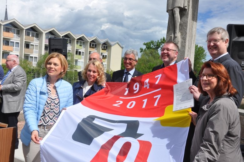 Die Jubiläumsfahne zum 70. Geburtstag von Rheinland-Pfalz hatte Innenminister Roger Lewentz (4.v.l.) mitgebracht.