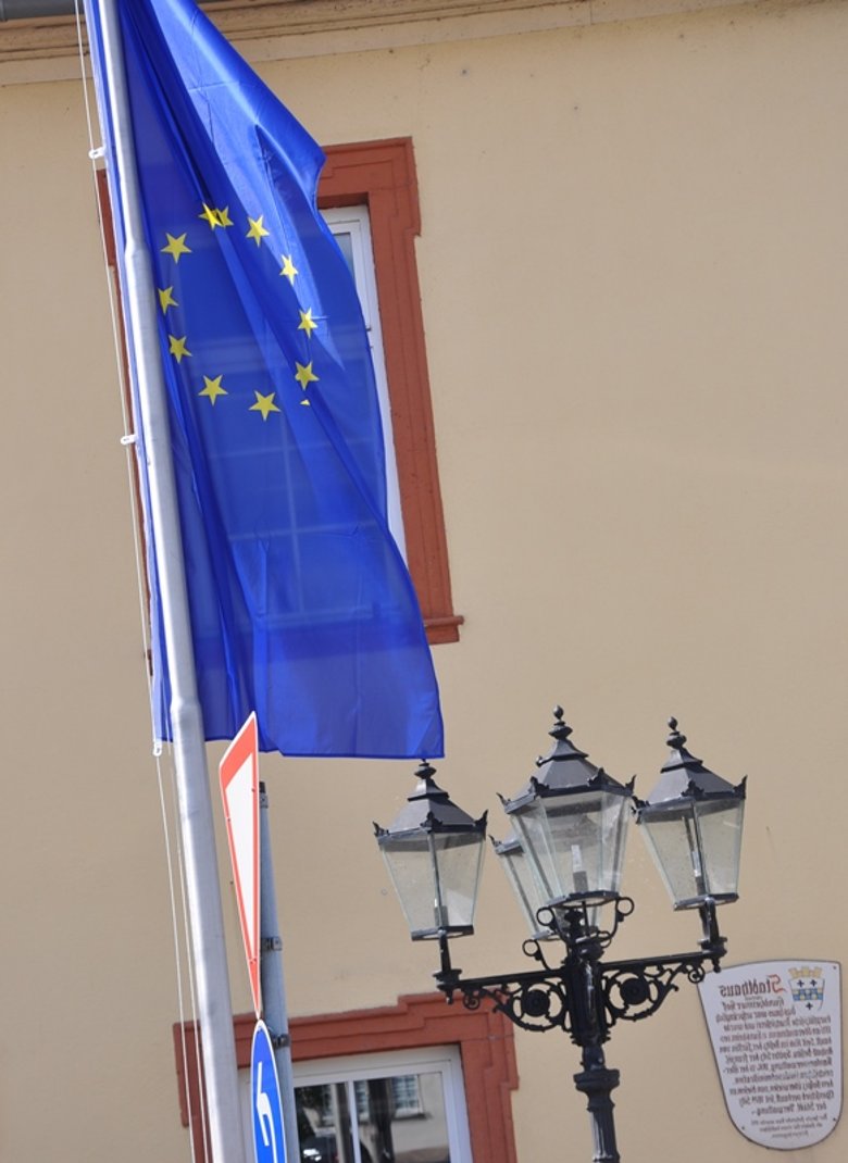 Der Besuch fand am Europatag, 9. Mai, statt. Am Stadthaus war die blaue Fahne mit den zwölf goldenen fünfzackigen Sternen geflaggt (Foto). Ein weiterhin friedlich in Freiheit vereintes Europa ist das, „was Ihr leben müsst“, appellierte die Oberbürgermeisterin an die Vertreter der jungen Generationen aus beiden Partnerstädten.
