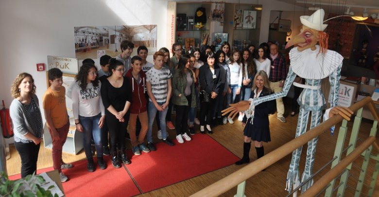 Eine Schülergruppe mit Lehrerinnen und Lehrern aus Bourg-en-Bresse war bis Dienstag Gast des Gymnasiums am Römerkastell. Bei einem Besuch des Museums für PuppentheaterKultur (PuK) mit einer Führung durch Wolfgang Reiche und Malika Goldt, war sie von Christine Simmich begrüßt worden (Foto unten).