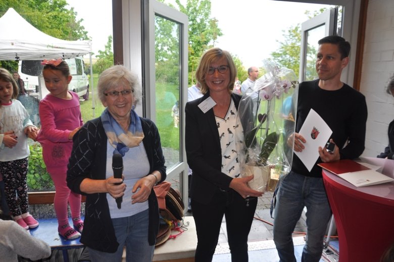 Foto unten: Mit Blumen bedankte sich Kita-Leiterin Leonie Matheis bei Monika Prieß, die eine Teinehmerurkunde für "Kita isst besser" überreichte. Mit auf dem Foto Tobias Pelzer, Horterzieher und Projektbeauftragter.