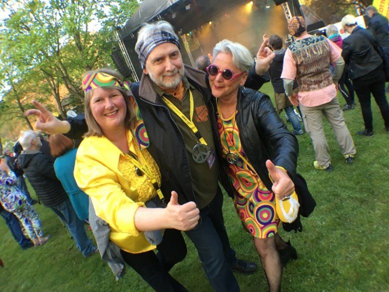 "Mr.-Kultursommer", Professor Jürgen Hardeck (Foto unten), und seine Mitarbeiterinnen Iris Kofoldt (links) und Christine Rupp hatten ihren Spaß und erschienen passend gekleidet im Outfit der späten 60er-Jahre.