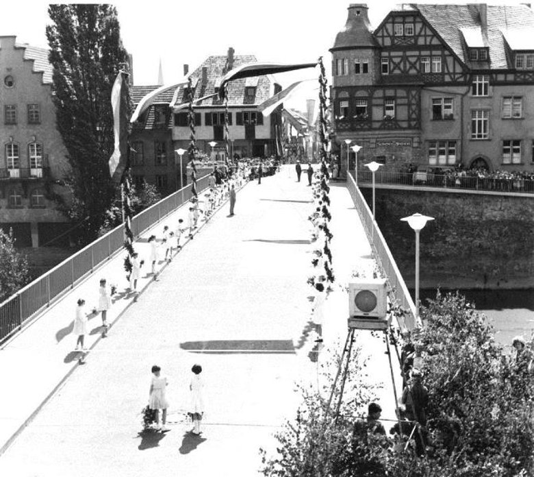 Foto unten; Die "Alte Nahebrücke" wurde am 16. Juli 1956 feierlich eingeweiht. Die Vorgängerbrücke war während des Zweiten Weltkrieges von der Wehrmacht gesprengt worden.