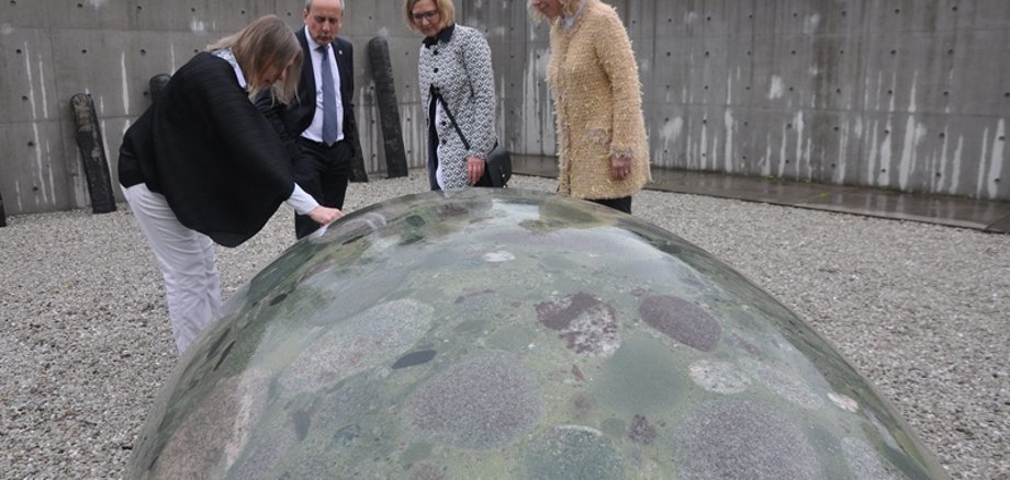 Foto: Oberbürgermeisterin Dr. Heike Kaster-Meurer, Kulturminister Konrad Wolf mit Ehefrau Silke Weber bewunderten im Steinskulpturenmuseum den von Anna Kubach-Wilmsen (links) geschaffenen Steinkokon (brasilianischer Verde Marinace)