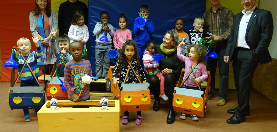 Auf dem Foto von links nach rechts: Die Kinder der evangelischen Kita Korellengarten sowie stehend hinten von links nach rechts Ursula Lubitz, Marc Kluschat und Peter Haas-Duchène von der Musikschule Mittlere, sitzend Kitaleiterin Birgit Zimmermann und vorne rechts stehend Klaus-Dieter Dreesbach.