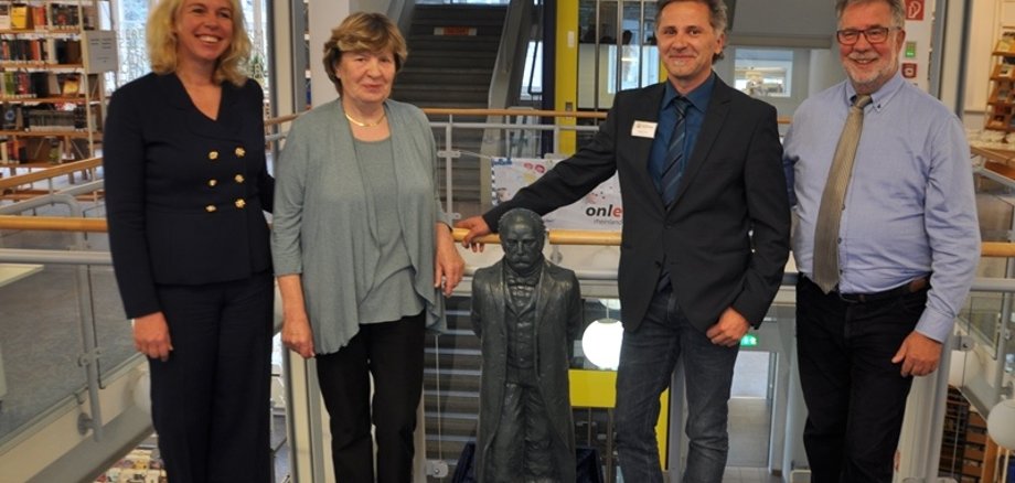 Foto oben: Jens-Peter Golde (rechts) und Margarte Jungblut (zweite von links) hatten aus Neuruppin eine Fontane-Skulptur als Geschenk mitgebracht, das Heike Kaster-Meurer und Stefan Meisel dankend entgegennahmen.
