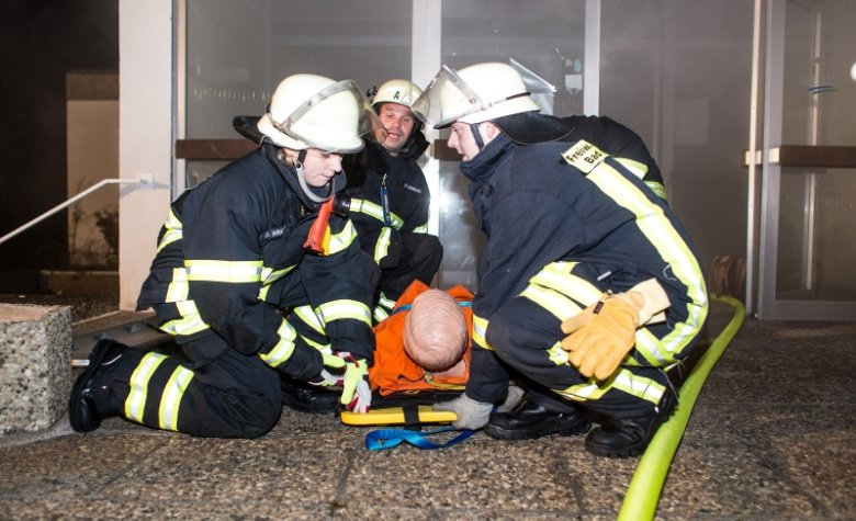 Die eintreffenden Einsatzkräfte des Löschbezirks West wurden sofort von dem Hausmeister eingewiesen, so dass der Angriffstrupp zur Menschenrettung unter schwerem Atemschutz in den Kellerraum vordringen konnte. Parallel wurde ein Sicherheitstrupp gestellt und zur Unterstützung die Kräfte des Löschbezirks Nord und des Führungsdienstes mit dem Einsatzleitwagen nachgefordert. Die Einsatzkräfte des Löschbezirks Nord konzentrierten sich unter schwerem Atemschutz auf die Menschenrettung im Erdgeschoss. Die Einsatzkräfte außerhalb des Gebäudes führten die Atemschutzüberwachung durch, belüfteten das Gebäude mit je einem Turbinen- und Wasserlüfter. Weiterhin wurde die Einsatzstelle umfangreich ausgeleuchtet, sowie die Wasserversorgung durch das Hydrantennetz und offenes Gewässer sichergestellt. In einer Übungsnachbesprechung zeigten sich die beiden Übungsleiter Steffen Frech und Heiko Hans mit dem praktischen Training der 35 Einsatzkräfte rundum zufrieden. Alle Übungsziele wurden erreicht.
