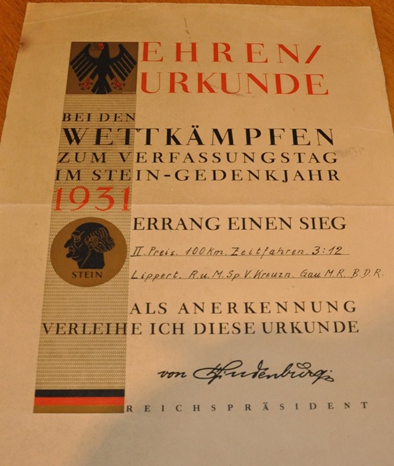 Für ein Foto vor der Radfahrerwand hat Chani senior seinen Renner mit aus dem Haus genommen einen „flotten Oldtimer und blaues Leichtgewicht“ aus dem Jahr 1984, der den Namen des italienischen Radweltmeister Gianni Motta trägt und von Lippert bestens gehegt und gepflegt wird. Der 82-jährige gehört zur mittleren Generation der erfolgreichen Radrennfahrer in der Familie Lippert. Vater Heinrich fuhr mit anderen Größen aus dem Radsportverein „Germania“ Bad Kreuznach, Gustav Schwarzmann, Eitel Drosse, Ludwig Hangen, in den 20er- und 30er-Jahren bei den Gaumeisterschaften Mittelrhein ganz vorne mit. Eine Ehrenurkunde von Reichpräsident von Hindenburg unterschrieben, weist Heinrich Lippert als Zweiter beim 100 Kilometer-Zeitfahren bei den Wettkämpfen zum Verfassungstag 1931 aus.