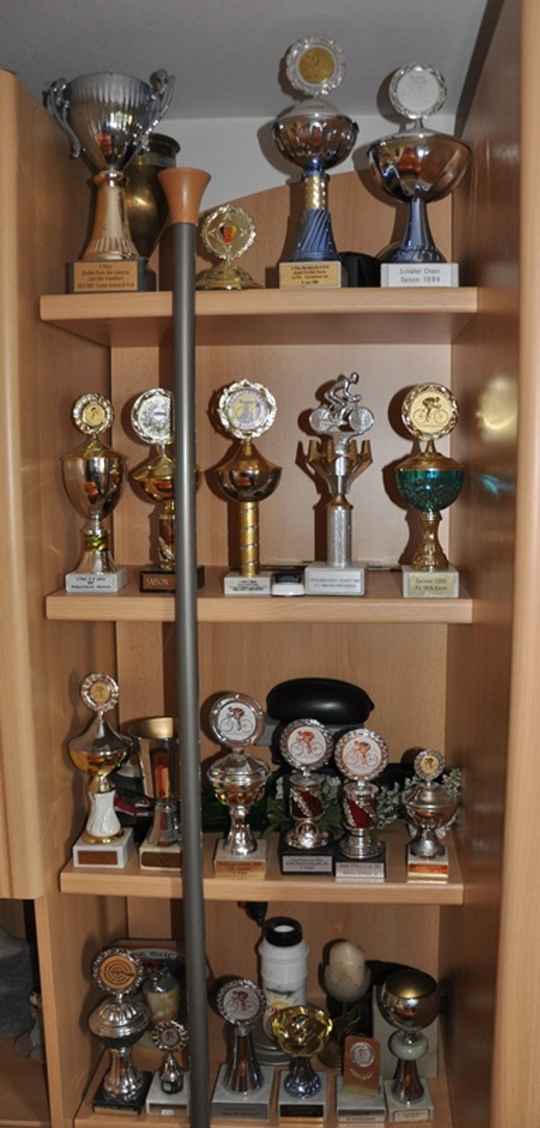 Die meisten der stattlichen Siegestrophäen, die einen Ehrenplatz im Hause Lippert haben, hat Enkel Chani gesammelt. „Der Bub war ein großes Talent. Da hatte auch Björn, der Sohn von Didi Thurau, keine Chance“, schwärmt der Opa, der mit dem Buben drei bis vier Mal in der Woche ein Trainingspensum von jeweils 30 bis 40 Kilometer absolvierte. Chani Schäfer startete für den VfL Bad Kreuznach und gewann bei dem Deutschland-Klassiker, dem Rad-Rennen rund um den Henninger-Turm in Frankfurt, in seiner Altersklasse. Ständige Rückenschmerzen durch zu schnelles Wachstum bewogen ihn dann im Alter von 14 Jahren den Radsport aufzugeben.