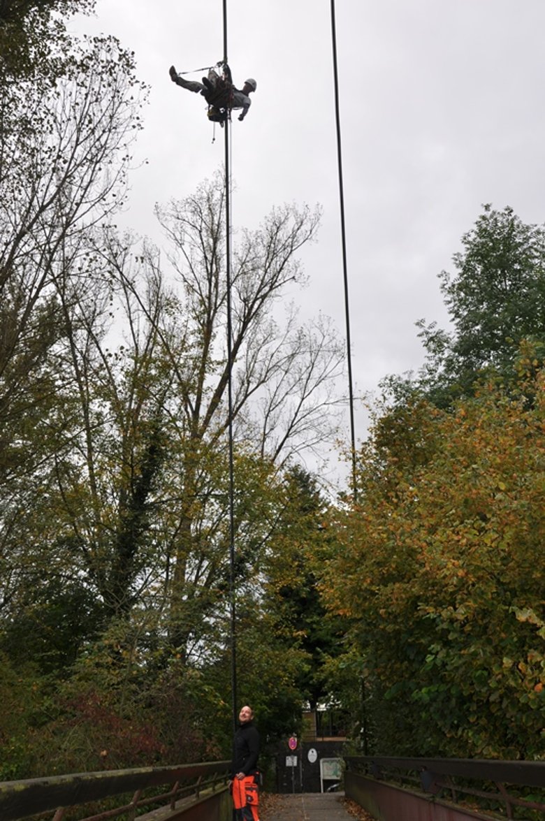 Foto: Industriekletterer aus Mannheim unterstützen Klaus Gnam (unten stehend) bei seiner Brückenprüfung.