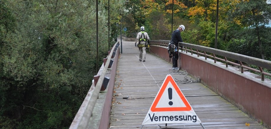 Fußgänger und Radfahrer bleiben stehen und blicken immer wieder nach oben. Die Industriekletterer kontrollieren die Stahlseile auf mögliche Risse und Korrosionsschäden. Auf der Brücke werden die Holzbohlen auf „Fäulnis“ untersucht. Überprüft werden alle Brückenbauteile, so auch der Beton. Als Sofortmaßnahme wurden über beschädigte angefaulte Holzbohlen Riffelbleche geschraubt, die für Stabilität sorgen.