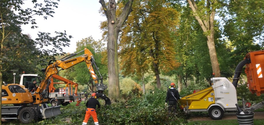 Sturmtief „Sebastian“ hatte einen 24 Meter langen Starkast in 9 Metern Höhe abgebrochen, so dass der Baum nicht mehr standsicher ist. Die städtische Baumkontrolle hatte nach dem Sturmschaden außerdem festgestellt, dass der Pilz „Zunderschwamm“ eine intensive Weißfäule im Stamm verursacht hat.