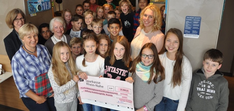 Oberbürgermeisterin Dr. Heike Kaster-Meurer lud die Siegerklasse mit der höchsten Spende (die heutige 6e mit 1681,20 Euro) in die Blaue Eisdiele ein und belohnte damit das ehrenamtliche Engagement. Gemeinsam mit Guntrun Bencker und Georg Schmidt freute sich Schulleiterin Anna Dicke (Foto unten rechts) über das bunte Gemälde, das Elisabeth Eminger (Foto mitte) als Geschenk aus Ruanda mitgebracht hatte.