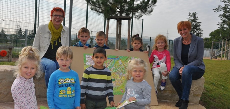 Foto: Den neuen Kinderstadtplan hat Monika Degen (links) in die Kita „zur Klaster“ nach Winzenheim mitgebracht. Auch die Leiterin des Amtes für Kinder und Jugend, Sabine Raab-Zell, ist mit dem Ergebnis sehr zufrieden.