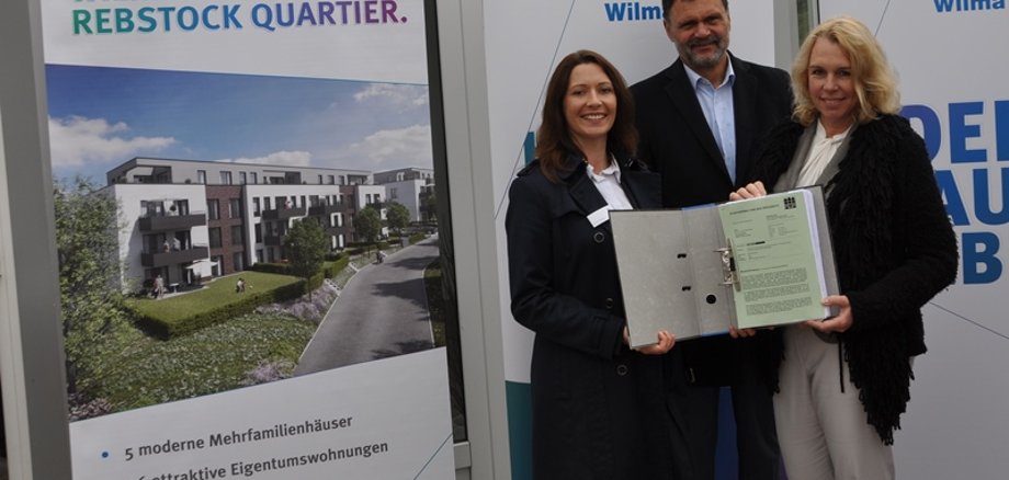 Foto: Im Beisein von Wilma-Geschäftsführer Thomas Jahn überreicht Oberbürgermeisterin Dr. Heike Kaster-Meurer der Projektleiterin Anna Reeg die Baugenehmigung.