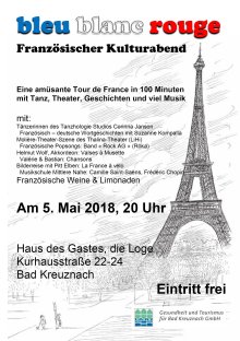 Zum Abschluss des Brückenfestes am nächsten Samstag, 5. Mai, lädt die Gesundheit und Tourismus für Bad Kreuznach GmbH um 20 Uhr zu einem französischen Kulturabend in das Haus des Gastes, Kurhausstraße 22-24, Bad Kreuznach ein. In einer Mélange aus Theater, Tanz, Texten und viel Musik präsentieren …