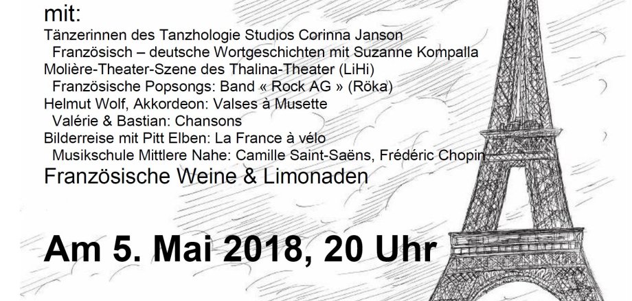 Die Rock-AG des Gymnasiums am Römerkastell interpretiert französische Popsongs und Musiker der Musikschule Mittlere Nahe Werke der Komponisten Camille Saint-Saëns, Frédéric Chopin und Yves Duteil. Tänzerisch wird der Tanz „Paris“ von Tänzerinnen des Tanzhologie Studios Corinna Janson dargeboten. Das Thalina Theater des Lina-Hilger-Gymnasiums zeigt eine Szene aus ihrem neuen Theaterstück „Der Bürger als Edelmann“ von Molière und Suzanne Kompalla präsentiert in unterhaltsamen Wortgeschichten, welche sprachlichen Einflüsse die Franzosen in der deutsche Sprache hinterlassen haben. Pitt Elben zeigt in einer Diashow Eindrücke einer Fahrradtour durch Frankreich und findet Spuren deutscher Exilautoren in Sanary-sur-Mer. Für den passenden musikalischen Rahmen sorgt Helmut Wolf auf seinem Akkordeon mit typisch französischen Valses à Musette und Valérie & Bastian steuern französische Chansons bei.