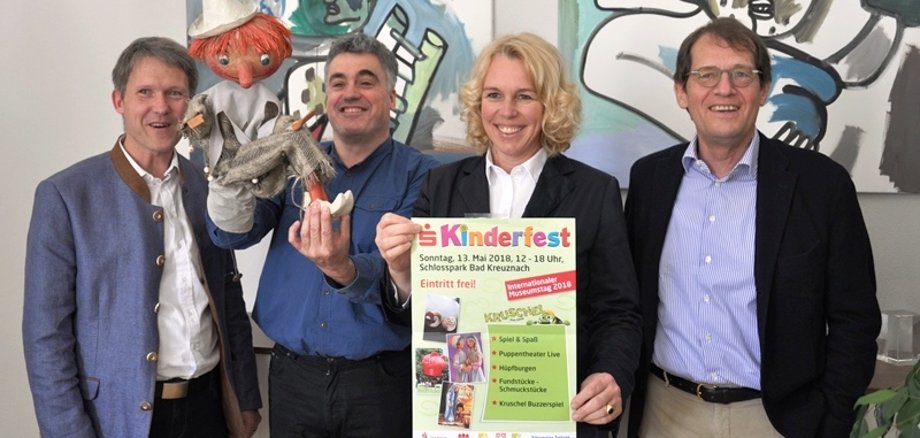 Foto, v. l.: Marco van Bel (Leiter Museen Schlosspark und Römerhalle), Markus Dorner (Leiter Museum für PuppentheaterKultur), Oberbürgermeisterin Dr. Heike Kaster-Meurer und Peter Scholten (Vorstandsvorsitzender Sparkasse Rhein-Nahe)