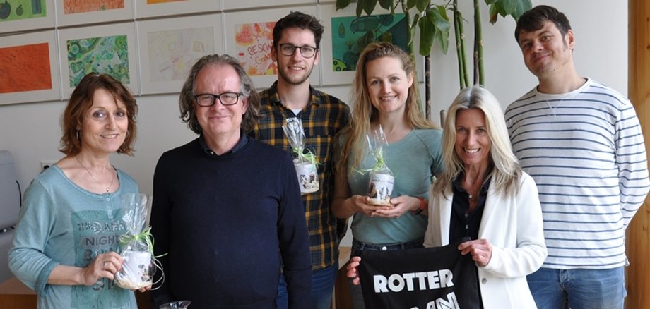 Foto (von links): Marie-Therese Adrian, Julian South, Gijs van Vlaardingen, Vivian Bis (Begleitpersonen Rotterdam) Christine Simmich (Internationale Beziehungen) und Matthias Magin (Klassenlehrer der 9b und Organisator des Austausches)