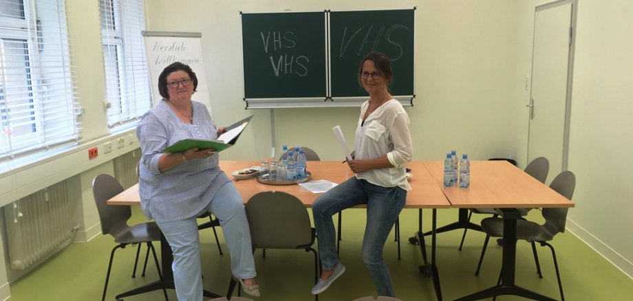 Foto: VHS-Geschäftsführerin Erika Roggendorf und VHS-Mitarbeiterin Angelika Jost stellen in den neuen Seminarräumen der Volkshochschule in der Wilhelmstraße das Programm für das 2. Halbjahr 2018 vor.
