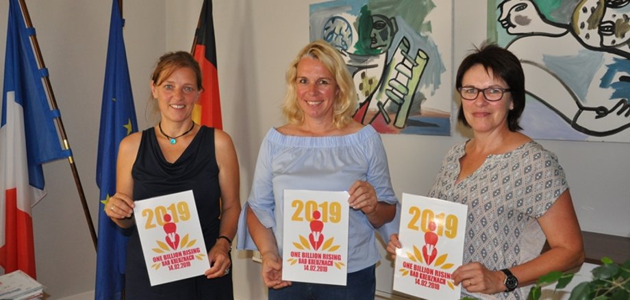 Foto, v. l.: Petra Wolf (Frauen helfen Frauen e.V. Bad Kreuznach), Oberbürgermeisterin Dr. Heike Kaster-Meurer und Andreas Maas (Erziehungs- und Familienberatungsstelle der Stadt und des Kreises Bad Kreuznach) werben für die Aktion "One Billion Rising" am 14. Februar.