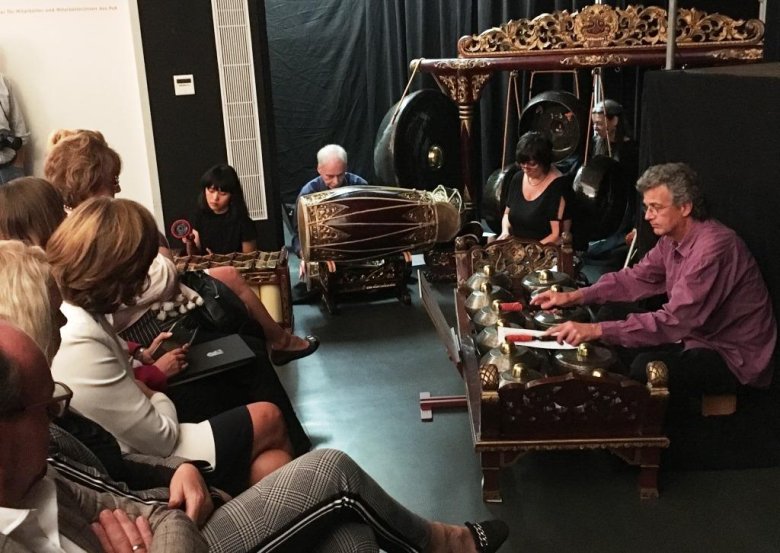 Foto unten: Bei der Eröffnung der Sonderausstellung „PuppentheaterKultur weltweit – Kulturerbe der UNESCO“ lauschten die Gäste – mit Ministerpräsidentin Malu Dreyer (im weißen Kostüm) als Ehrengast − den Klängen der Indonesischen Gamelan-Musik.