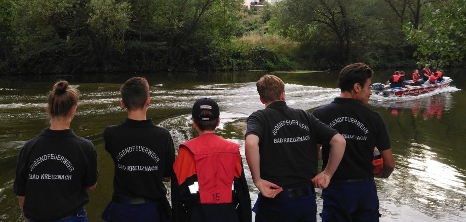 Die Jugendlichen waren begeistert, als die Betreuer mit ihnen in den Stadtteil Bad Münster-Ebernburg fuhren und dort die Kameraden des Löschbezirks West mit ihrem Rettungsboot (RTB) warteten. Nachdem die jungen Wehrleute gezeigt bekamen, wie das RTB zu Wasser gelassen wird, wurde ihnen das Verhalten am und auf dem Wasser während der Einsätze erklärt. Nach dieser schnellen Einweisung war es dann auch schon Zeit auf das Wasser zu gehen. In Vierergruppen fuhren die Jugendlichen zwischen der Friedens- und der Nahebrücke für rund zehn Minuten. Große Verwunderung entstand, als der Bootsführer mit einer Gruppe der älteren Jugendfeuerwehrmitglieder einen Motorschaden simulierte und das Boot mit Paddeln wieder zur Anlegestelle befördert werden musste.