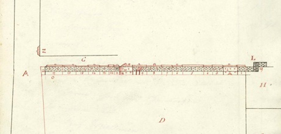 Am 26. Januar 1821 wurden die Anwohner der Hundsgasse (ab Dez. 1880 Gerbergasse) eingeladen, am 31. Januar nachmittags um 4 Uhr ins Stadthaus zu kommen. Hauptanlass war der öffentliche Verkauf von Teilen des alten verfüllten Stadtgrabens, eines geräumigen Platzes, der teils als Zimmerplatz und teils zur Aufbewahrung von Straßendung genutzt wurde. Im Vorfeld der Versteigerung hatte Renovator Wenzel einzelne Loose vermessen. Die zu veräußernden Stücke lagen hinter den in der Hundsgasse an der alten Stadtmauer stehenden Gebäuden und orientierten sich an der Breite der Häuser. Die stark vereinfachte mit schwarzer und roter Tusche gefertigte Handskizze vermittelt dem Betrachter einen Überblick über die räumlichen Zusammenhänge des Gebietes im Bereich des heutigen Holzmarktes