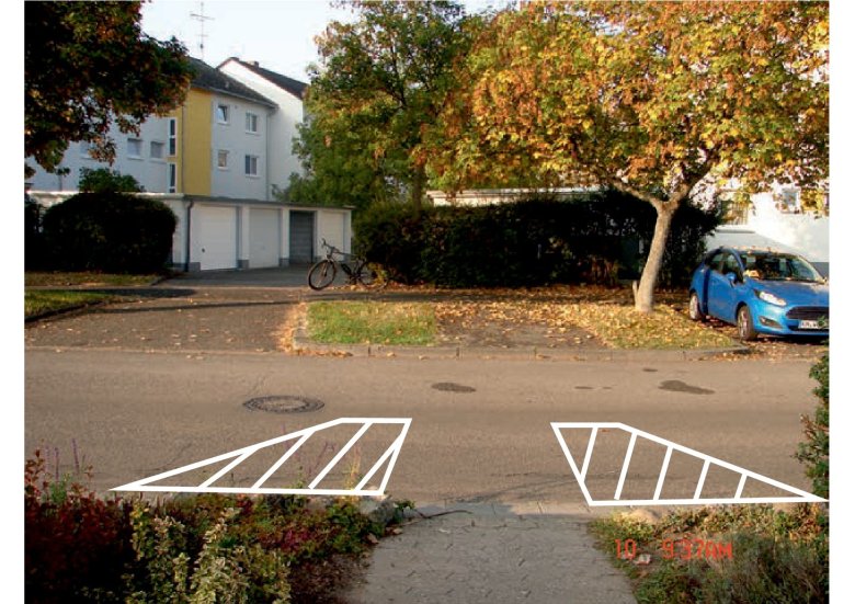 Schon jetzt wird das Verkehrskonzept um folgende Maßnahme angepasst: In der Holbeinstraße werden Markierungen an den Einmündungen der Erschließungswege der Reihenhäuser aufgebracht, um die Fußgängerquerungen zwischen den parkenden Autos sicherer zu machen (Foto unten).
