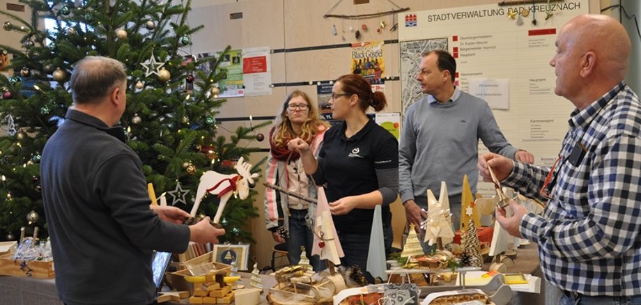 Gefaltet, gewachst und gebügelt sind die Geschenktüten, die die Lebenshilfe-Werkstätten Bad Kreuznach in ihrem Weihnachtsbasar anbieten. Viele Artikel aus Holz, wie Grillanzünder, Deko-Kerzen, Kisten, aber auch Säckchen mit Kirschkernen und Rapssamen gefüllt, sind im Angebot. Alexandra Rodrigues (Mitte), Lara Kurz und Martin Merz freuen sich auf ihren Besuch. Bei den Mitarbeitern im Stadthaus, hier zu sehen Karl Distler (rechts) und Jürgen Schell, haben die schönen Geschenkartikel für vorweihnachtliche Freude gesorgt.