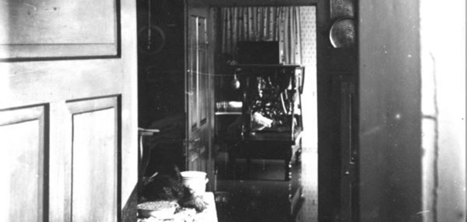 Das Januar-Hochwasser von 1918 richtete in Kreuznach verheerende Schäden an. Auf dem Schwarz-Weiß-Foto von Johanna Amalie Cornelia Emilie Schmithals gen. Nelli (1880-1975) ist der Blick in das Erdgeschoss des Wohnhauses Kurhausstraße 17 zu sehen, das der Familie Schmithals gehörte und ebenfalls von der Überflutung betroffen war. Eine ungefähre Orientierung, wie hoch der Wasserstand zum Zeitpunkt der Aufnahme war, bietet der Tisch im hinteren Zimmer, unter dem das Wasser etwa in Sitzhöhe eines Stuhles (zirka 45 Zentimeter) steht. Das Foto vermittelt mit den hochgestellten Möbeln und den geöffneten Türen Schutzmaßnahmen, die gegen die eindringenden Wassermassen ergriffen worden sind, wobei sich der Eindruck aufdrängt, dass die Bewohner vom Hochwasser überrascht wurden, da viele Möbel im Wasser stehen. Daneben bietet es einen Blick in die Privaträume eines bürgerlichen Haushaltes, der sich u.a. in schweren, gediegenen Massivholzmöbeln, porzellanenen und gläsernen Gebrauchsgegenständen, wie an den Wänden befindlichen Kunstgegenständen darstellt. Die Räume sind elektrifiziert, mit Tapeten versehen und Vorhänge verhindern den ungestörten Blick ins Innere des Hauses. Ein Sinnspruch, der über einer hölzernen Türzarge angebracht ist: „Such in der Arbeit Deine Ruh − den Segen gibt schon Gott dazu“ verweist möglicherweise auf die Geisteshaltung Hausbewohner. 2007 wurde dem Stadtarchiv durch Nina Gampper eine bedeutende und umfangreiche Sammlung überreicht (überwiegend Glasnegative und Fotoabzüge), die den größten Teil des Lebenswerkes der Kreuznacher Fotopionierin Nelly Schmithals umfasst. Das Foto ist Bestandteil dieser Schenkung.