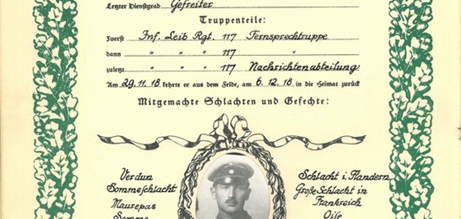 Die Aufnahme zeigt das Deckblatt der „Ehrenchronik“ der Ortsgemeinde Planig, die Ende der 1930er Jahre, wahrscheinlich um 1937, angelegt wurde. Darin sind in alphabetischer Reihenfolge 194 Kriegsteilnehmer aufgelistet. Auf Gedenk- und Ehrenblättern, die Gedenkblätter sind den Gefallenen vorbehalten, wurden die biographischen Daten der Soldaten, häufig ihre Fotos, Dienstzeit, letzter Dienstgrad, Auszeichnungen, Verwundungen, Schlachten und Gefechte, Gefangenschaft, Begräbnisort etc. niedergeschrieben. Die Chronik, ein Vordruck, gestaltet von Adolf Hafner, liegt als gebundenes Buch vor, mit blauem Leinen eingeschlagen und mit einer Goldprägung versehen. Die beigefügten Informationen zu Entstehung und Verlauf des Krieges, insbesondere des „Friedensvertrages von Versailles“ sind zeitbedingt polemisch zugespitzt. Das Ausfüllen der Vordrucke in Hand- bzw. Schönschrift wurde von dem Verlag Ludwig Cronauer aus Primasens besorgt. Die Ehrenchronik ist von hohem historischem Wert. Sie dokumentiert Einzel- und Familienschicksale und stellt gleichzeitig ein Zeugnis der Erinnerungskultur eines Dorfes zum ersten Weltkrieg dar.