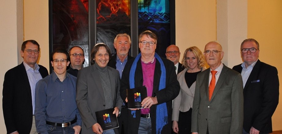 Foto: Die Übergabe der Festschrift „Simchat Tora“ war der Anlass für ein Treffen von Menschen, die das Projekt „Glaskunstwerk und Festschrift“ unterstützten und realisierten: Peter Scholten (Sparkasse Rhein-Nahe), Jonas Blaesy (Festschrift), Valeryan Ryvlin, René Blättermann, Uli Holzhausen (Festschrift), Hansjörg Rehbein, Hans Bergs (Projektgruppe), Heike Kaster-Meurer, Werner Fuchs und Jürgen Rothenberger.