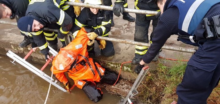 Ein Feuerwehrmann, welcher sich bereits auf der Anfahrt mit einem Überlebensanzug ausgerüstet hatte, stieg gesichert an einer Feuerwehrleine in gebührendem Abstand zu dem Tier ins Wasser. Das Wildschwein war zwischenzeitlich unter der Palette ausgebüchst, kam aber aus eigener Kraft nicht aus dem Wasser und trieb weiter ab. Zwei Steckleiterteile wurden verwendet, um das Tier zu lenken. Kurz vor der Fußgängerbrücke Nähe des Pumpenhäuschens an der Salinenbrücke, konnte das Wildschwein mit beiden Leiterteilen fixiert werden. Der Kamerad im Schutzanzug, konnte das Tier mit einem beherzten Griff an dessen Hinterläufe aus dem Wasser heben. Vorsorglich wurde auch der Rettungsdienst an die Einsatzstelle bestellt, falls sich das aufgeregte Tier mit Bissen gegen die Rettung gewehrt hätte. Wieder an Land, lief das Wildschwein selbstständig zurück in den Wald (Foto unten).