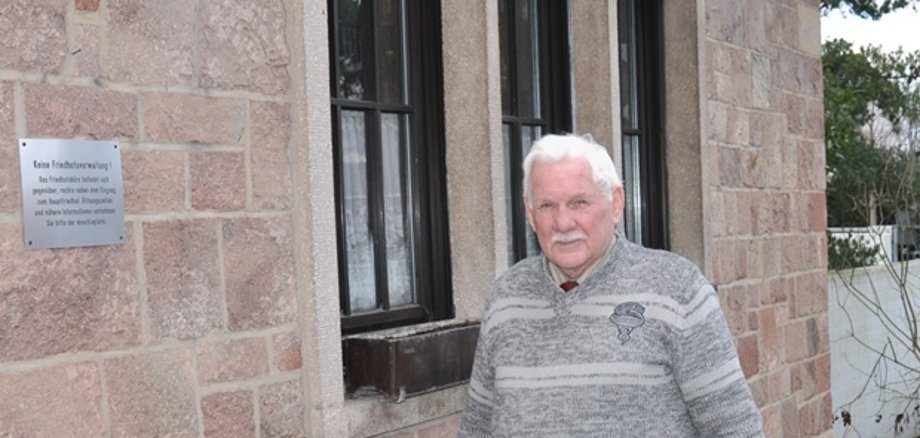 Foto: Karl Krause ist der Bewohner des Hauses am Friedhofseingang Mannheimer Straße. Trotz des Schildes „Keine Friedhofsverwaltung“ wird immer wieder an der Tür geklingelt oder an den Fenstern geklopft. Als Friedhofsschließer ist Karl Krause nun im Ruhestand.